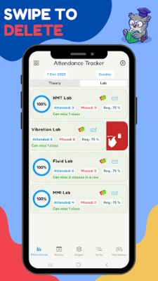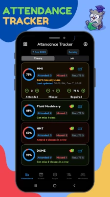 Track attendance across all subjects, manage your timetable, and calculate how many classes you can bunk—without falling below your college's attendance rule (like the 75% minimum).